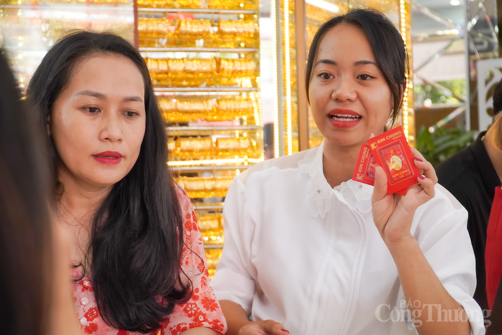 | Như mọi năm, các doanh nghiệp kinh doanh vàng đã chuẩn bị các sản phẩm vàng miếng thần tài cho khách hàng lựa chọn. Chị Thanh Thủy, nhân viên tiệm vàng Kim Chung đang giới thiệu các miếng vàng may mắn có trọng lượng 1 chỉ đến khách hàng. "Vàng phong thủy, miếng vàng 24K chữ Tài, Lộc, An, hình rồng… được khách lựa chọn mua khá nhiều. Chúng tôi cũng bán các miếng vàng may mắn có trọng lượng 0,5 chỉ để phù hợp với túi tiền của người mua", chị Thủy nói. |