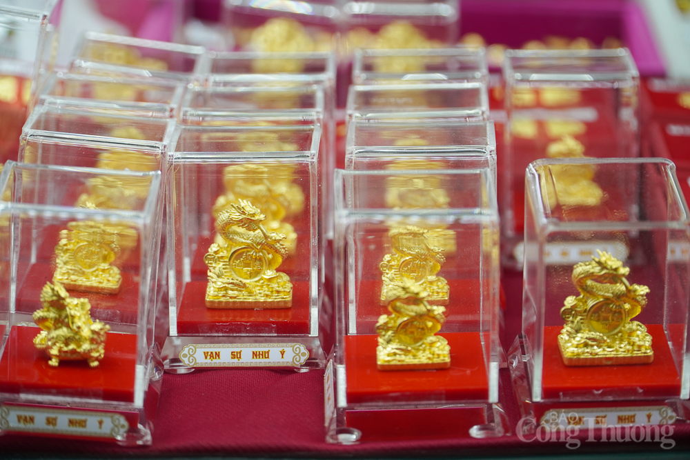 | Tiệm vàng Hồng Phát, đường Ngô Gia Tự bày bán sản phẩm vàng hình rồng - linh vật năm nay. Bà Trần Mỹ Linh, chủ tiệm vàng, cho biết các sản phẩm tượng rồng vàng có trọng lượng từ 0,5 đến 2 chỉ, mới được cửa hàng bổ sung để bán trong dịp ngày Vía Thần Tài song có khá nhiều khách hàng tìm mua. |