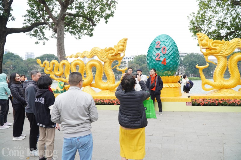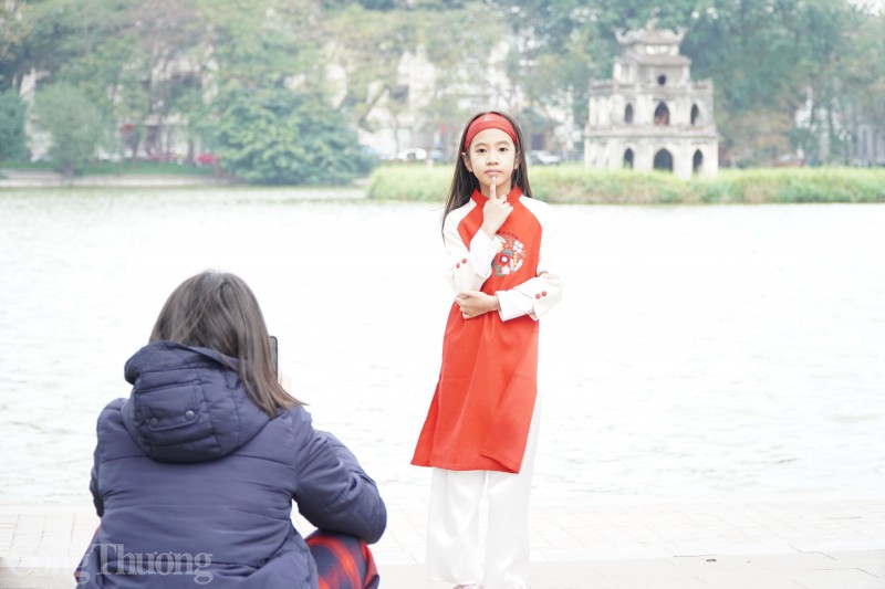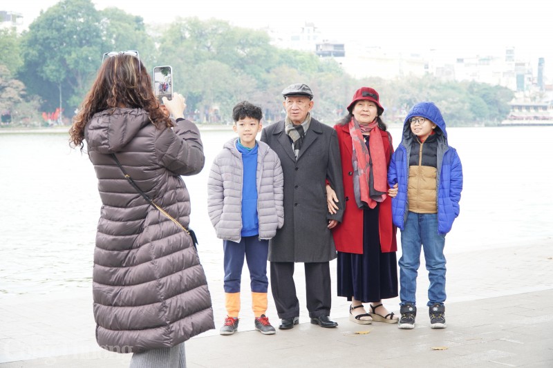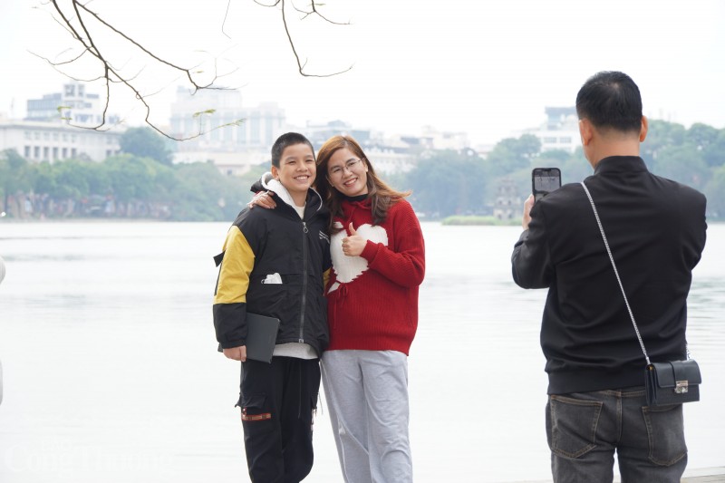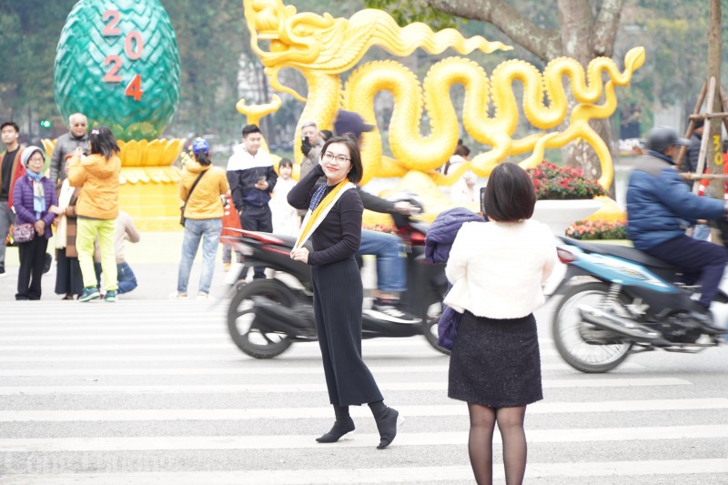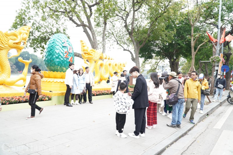 Chiều mùng 1 Tết, không khí tại khu vực xung quanh Hồ Hoàn Kiếm (Hà Nội) nhộn nhịp do dòng người đổ về đây du xuân, chụp hình. Nhiều gia đình tự tay chụp ảnh bằng điện thoại. Bên cạnh đó, hàng trăm tay máy khác cũng đổ về Hồ Gươm để ghi lại những khoảnh khắc đầu tiên của năm mới Giáp Thìn.