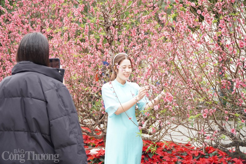 Nhiều bạn trẻ mặc áo dài tới đây để chụp ảnh cùng hoa đào.