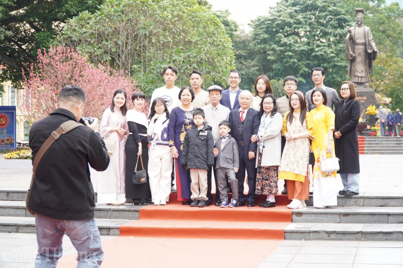 Một đại gia đình cùng nhau chụp ảnh trước tượng đài vua Lý Thái Tổ, lưu giữ khoảnh khắc đầu năm mới.