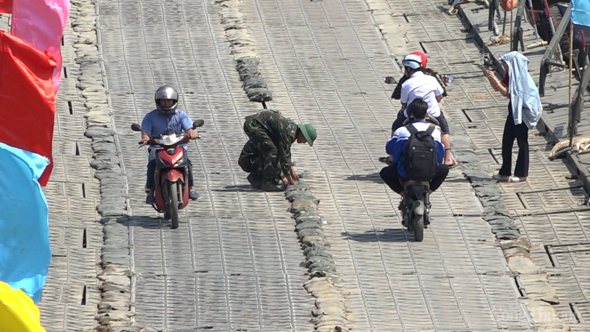| Theo người dân, cầu phao Phong Châu được quân đội dựng rất chắc chắn, đảm bảo an toàn |