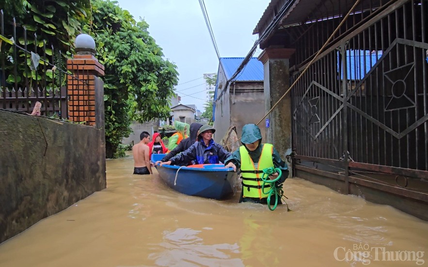 | Tại một số khu vực của TP. Thái Nguyên, nước lũ vẫn chưa rút hẳn. Lực lượng chức năng vẫn tiếp tục hỗ trợ người dân vượt qua chỗ ngập, tiếp tế lương thực, thực phẩm, đặc biệt với những khu vực khó di chuyển, ngập sâu - Ảnh: Mạnh Thắng |