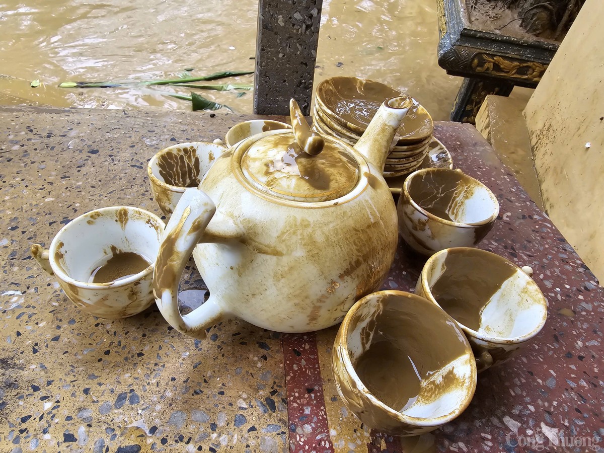 | Bộ ấm chén bị bám đầy bùn nhão - Ảnh: Thảo Nguyên |
