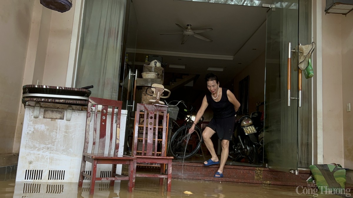| Từ trưa, bà Yến (ở phường Hoàng Văn Thụ) dùng vòi nước, chổi để rửa trôi lớp bùn non bám trên sân trước nhà mình. "Khi nước vừa rút xuống mình phải xịt rửa ngay. Nếu để bùn non khô lại sẽ rất khó có thể lau sạch và có mùi hôi khó chịu", bà Yến nói. |