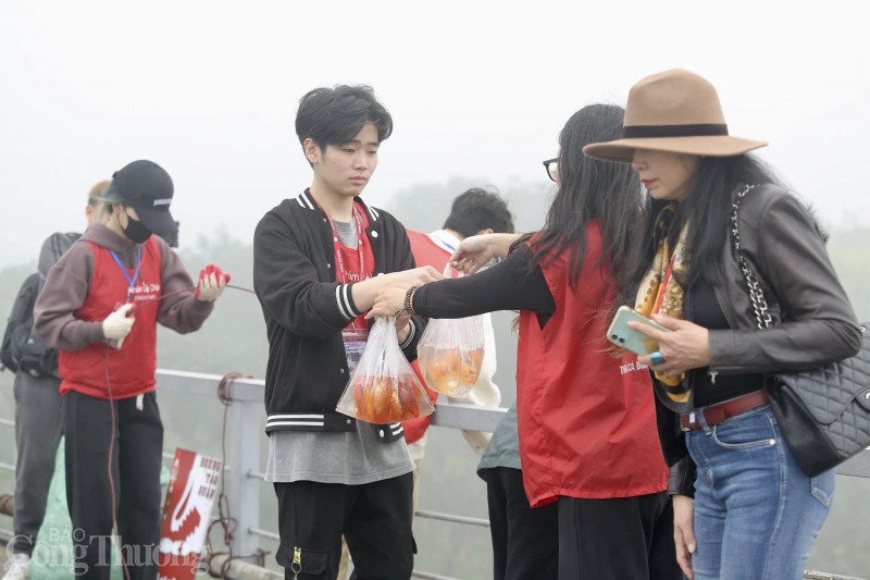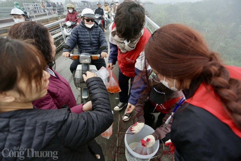 | Khu vực cầu Long Biên cũng có nhiều người dân tới phóng sinh. Tại đây, một nhóm tình nguyện viên trẻ tuổi có tên Đường Táo Quân đã có mặt, hỗ trợ người dân thả cá |