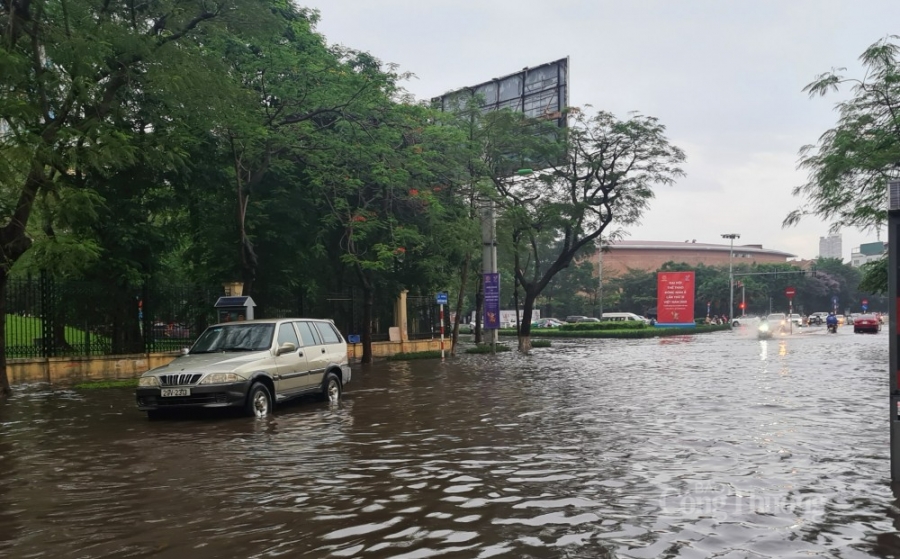 | ... và ngã 3 Tôn Thất Thuyết đều ngập sâu trong nước |