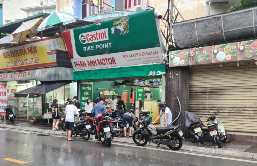 | Một cửa hàng xe trên phố Đội Cấn quá tải xe đến thổi khô bugi vì bị ngập nước, chết máy |