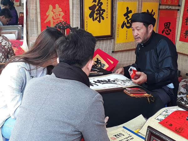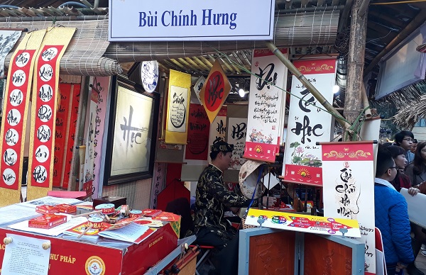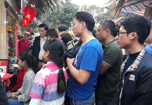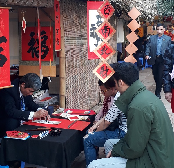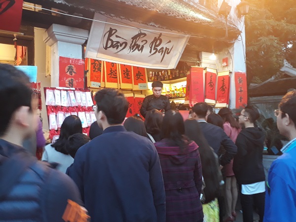 | Trong khi ở Hồ Văn có các ông đồ trực tiếp viết và cho chữ với giá 100 đến 200 nghìn đồng/bức, tại khu hàng lưu niệm sân Thái Học bàn thư pháp viết sẵn được bày ra, bán với giá đại trà 120 nghìn đồng/bức. Người dân chen chúc mua chữ viết sẵn để tiện dâng xin lên các nho học, hiền tài trong nơi thờ tự |