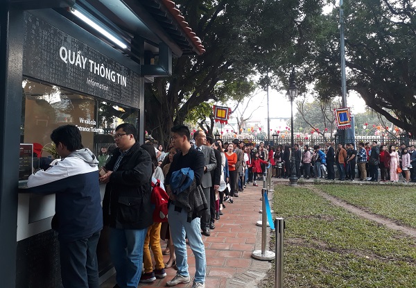 | Ngày mùng 1 Tết rất đông du khách xếp hàng chờ đến lượt mua vé qua cổng Văn Miếu – Quốc Tử Giám |