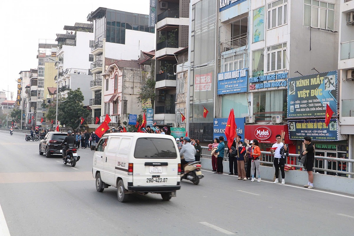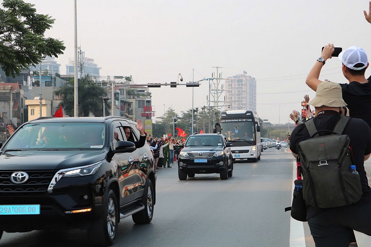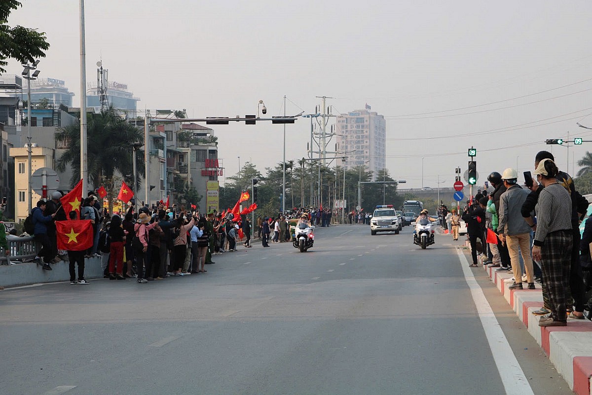 Đoàn xe chở đội tuyển Việt Nam xuất hiện trong sự đón chào nồng nhiệt từ người hâm mộ. Ảnh: Phong Lâm