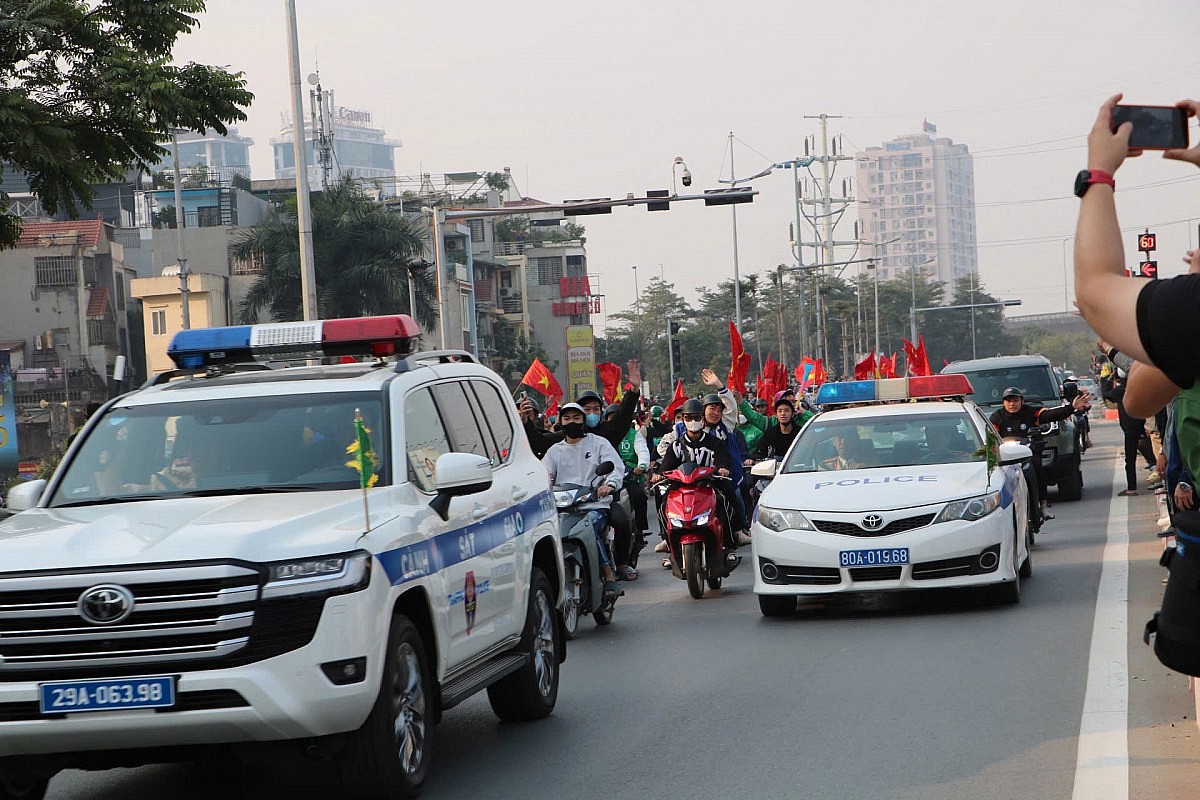 Đoàn xe chở đội tuyển Việt Nam từ sân bay Nội Bài về trung tâm thành phố. Ảnh: Phong Lâm