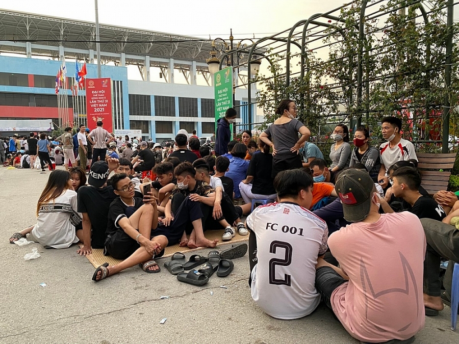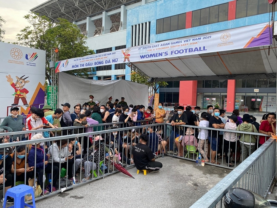 | Tại khu vực sân vận động Cẩm Phả, nhiều người hâm mộ đã có mặt từ sáng sớm xếp hàng trước các điểm phát vé xem trận Chung kết bóng đá nữ giữa Việt Nam và Thái Lan. |