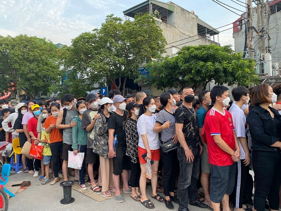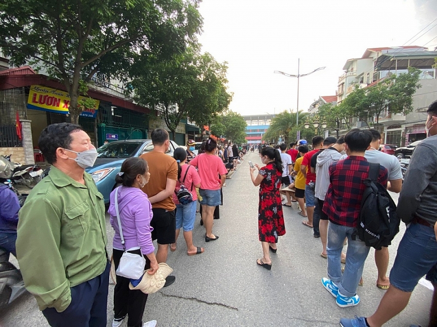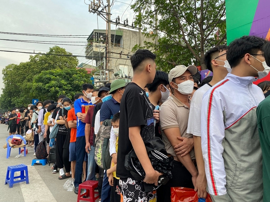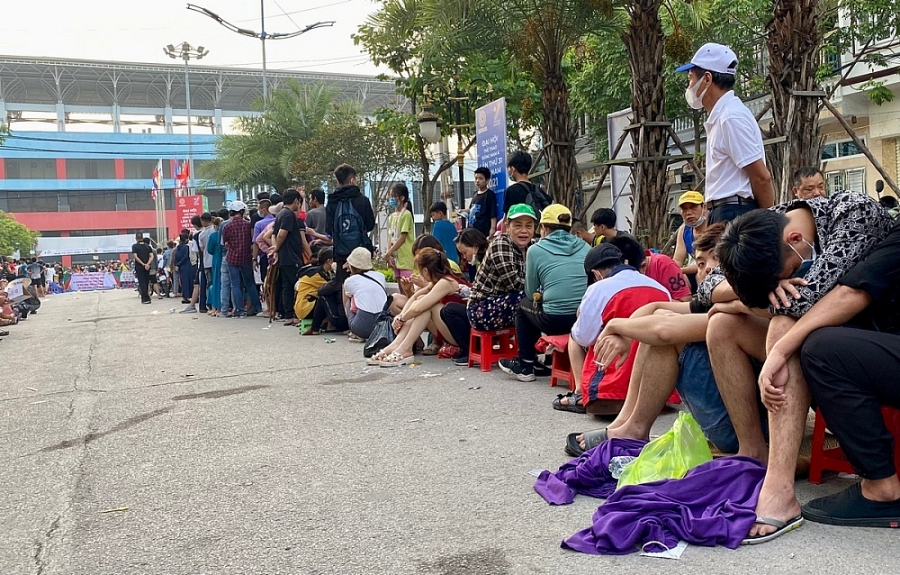 | Hàng dài người hâm mộ xếp hàng kéo dài hết đường Võ Huy Tâm - tuyến đường chính dẫn vào sân vận động Cẩm Phả. |