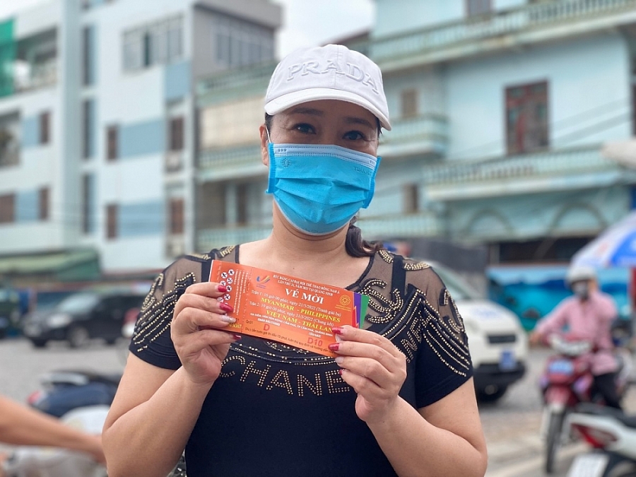 | Một cổ động viên vui mừng khi có trong tay tấm vé xe chung kết bóng đá nữ SEA Games 31 |