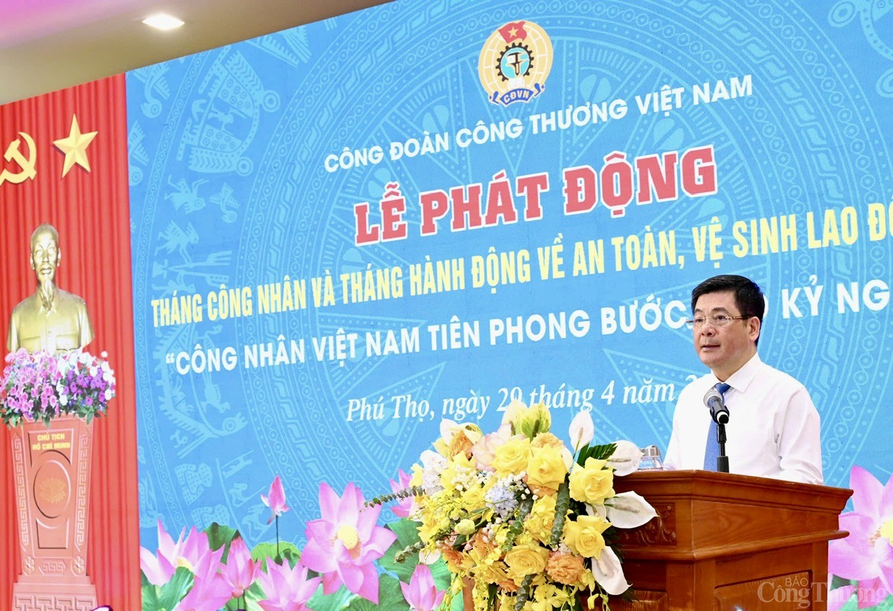 | Bộ trưởng Bộ Công Thương phát biểu tại Lễ phát động Tháng Công nhân và Tháng hành động về an toàn, vệ sinh lao động năm 2025. Ảnh: Cấn Dũng |