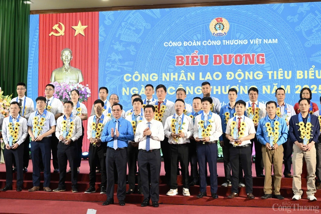 | Bộ trưởng Bộ Công Thương Nguyễn Hồng Diên, Chủ tịch Tổng Liên đoàn Lao động Việt Nam Nguyễn Đình Khang biểu dương “Công nhân lao động tiêu biểu ngành Công Thương – 2025”. Ảnh: Cấn Dũng |