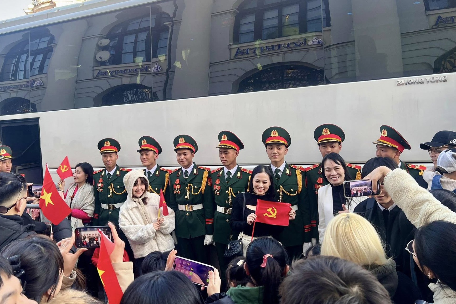 | Anh Trần Đức Tùng (ngoài cùng bên trái) và du học sinh tay cầm cờ Việt Nam chào đón cán bộ, chiến sĩ đoàn Quân đội nhân dân Việt Nam. Ảnh: Đức Tùng |