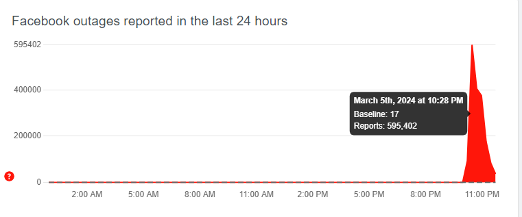 | Ghi nhận từ chuyên trang theo dõi "sức khỏe" mạng xã hội Downdetector, tính tới thời điểm 10h28 phút tối 5/3, có tới hơn 595.000 lượt báo cáo về lỗi Facebook bị sập |