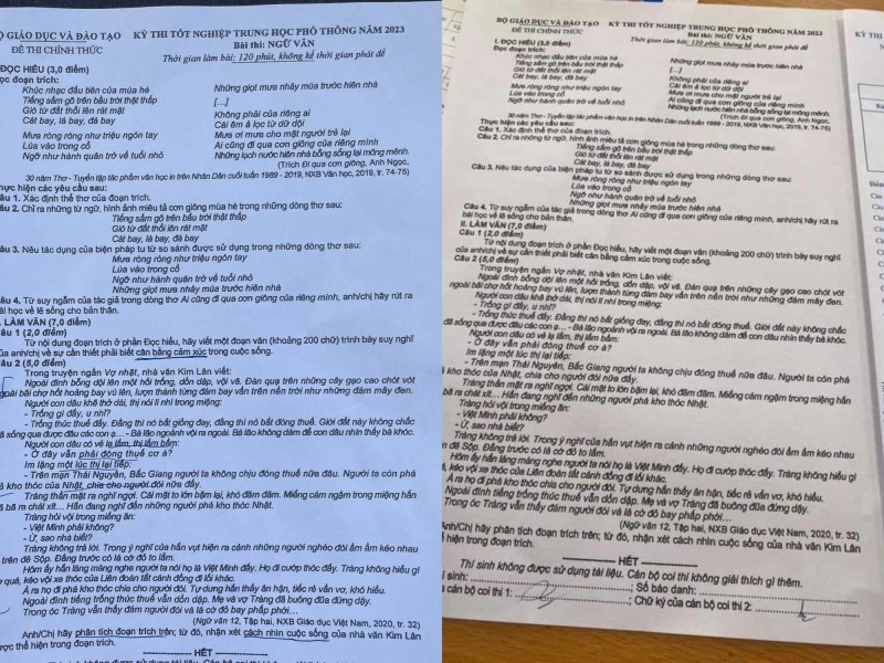 Trước đó, khoảng 8h ngày 28/6, sau khi thí sinh bắt đầu làm bài khoảng 30 phút, trên mạng xã hội facebook lan truyền hình ảnh chụp đề thi chính thức môn Ngữ văn, Kỳ thi tốt nghiệp Trung học phổ thông năm 2023.