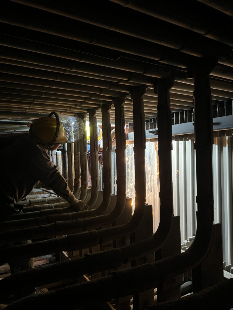 | Sửa chữa lò hơi với không gian kín và nhiệt độ hơn 40 độ C tại Nhà máy Nhiệt điện Thái Bình 2. |