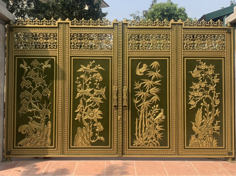 Cánh cổng với hoa văn Tùng, Cúc, Trúc, Mai được chạm khắc tinh xảo