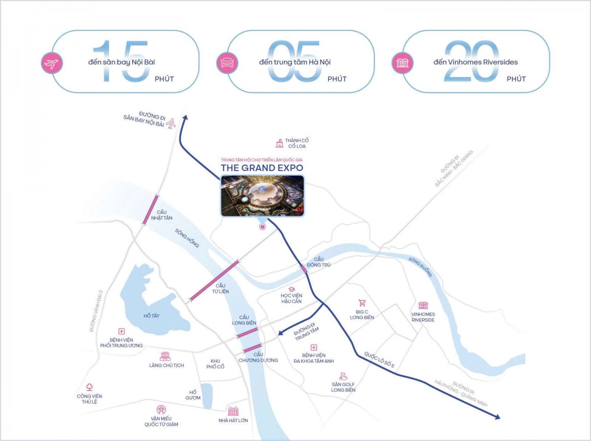 Ngoài việc kế cận cầu Tứ Liên, vị trí có 1-0-2 của Vinhomes Global Gate còn đến từ khả năng kết nối dễ dàng với hạ tầng giao thông đồng bộ đã hiện hữu, như cầu Đông Trù, cầu Thăng Long, cầu Nhật Tân, Quốc lộ 5… Từ vị trí đắc địa của siêu đô thị này, chỉ mất 5 phút để đến với trung tâm thủ đô (qua cầu Tứ Liên) hay 15 phút đế đến với Sân bay Nội Bài - cửa ngõ kết nối quốc tế của cả miền Bắc.