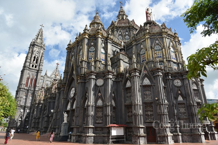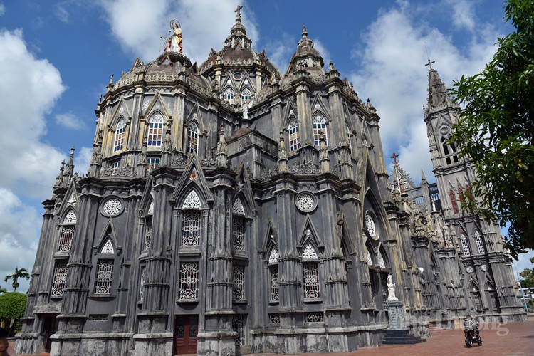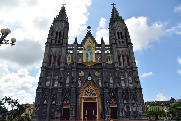Càng đến gần và càng quan sát tỉ mỉ kiến trúc nhà thờ, ta càng nhận thấy đây là một công trình kiến trúc cầu kỳ, hoành tráng. Nóc nhà được thiết kế mái vòm cùng các chóp nhọn vươn cao, phía trước nhà thờ được xây dựng với hai tòa tháp cao hai bên, ở giữa là cửa chính đi vào thánh đường và bên trên có đền tưởng niệm Đức Mẹ La Vang và Đức Thánh Tâm Chúa.