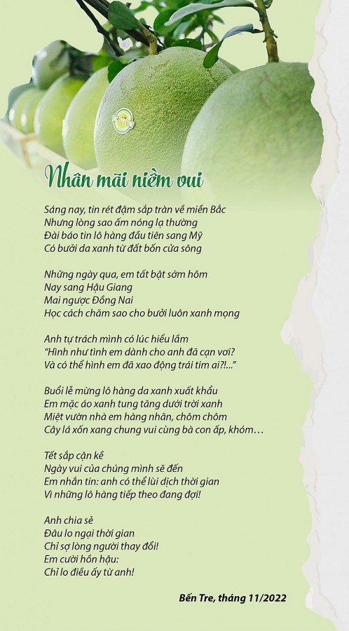 Đọc hết bài thơ “Nhân mãi niềm vui” mới thấy, thì ra niềm vui từ việc những trái bưởi căng mọng được xuất khẩu chỉ là “cái cớ” vô cùng đáng yêu, để tác giả bài thơ có dịp bày tỏ tình yêu với đời, với người, với sự đổi thay từng ngày của quê hương, đất nước…