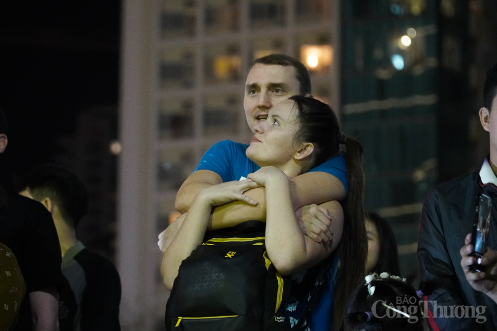 | Cặp đôi du khách nước ngoài trao vòng tay ấm áp trong thời khắc chuyển giao năm cũ sang năm mới. |