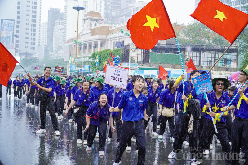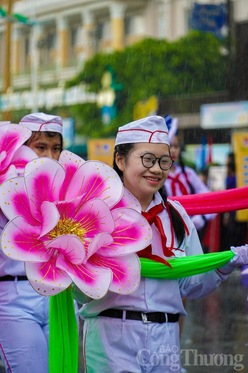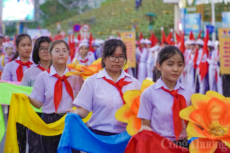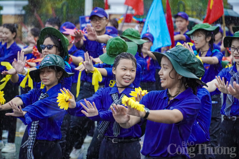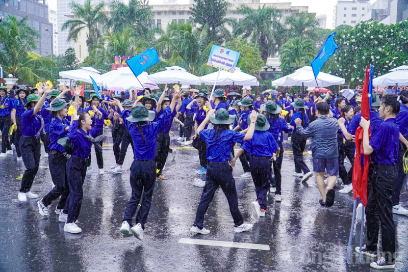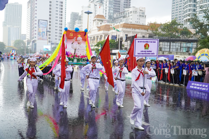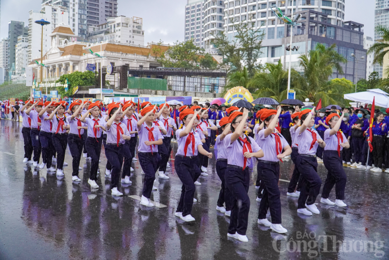 Gần 3.000 đoàn viên, thanh niên, đội viên, học sinh trên địa bàn thành phố Nha Trang (Khánh Hòa) đã cùng "đội mưa" diễu hành nghi thức Đội và múa dân vũ.