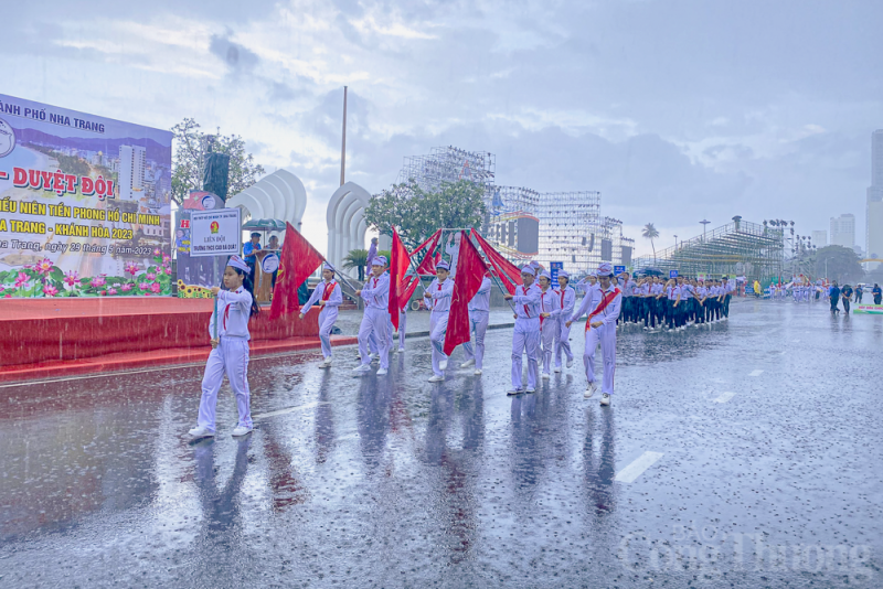 | Ngay khi Hội thi bắt đầu, thành phố Nha Trang có mưa nặng hạt nhưng các em học sinh vẫn tiếp tục diễu hành nghi thức Đội. |