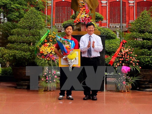 | Ủy ban Nhân dân tỉnh Thừa Thiên-Huế tặng Bằng khen cho em Hồ Đắc Thanh Chương. (Ảnh: Hồ Cầu/TTXVN) |
