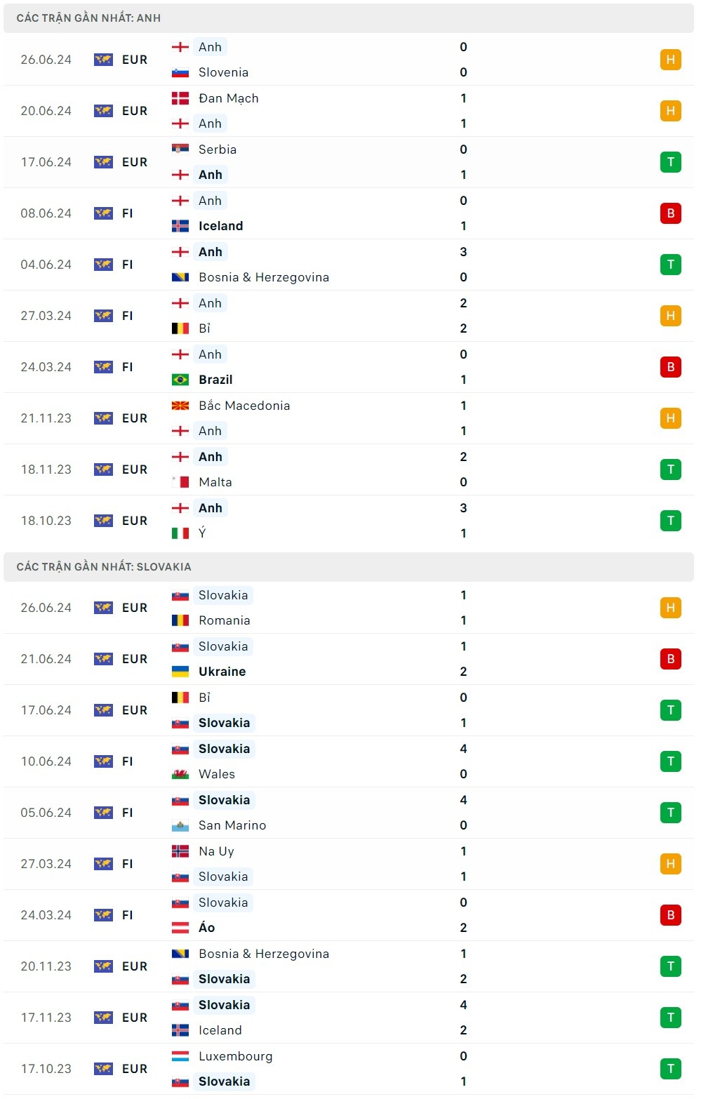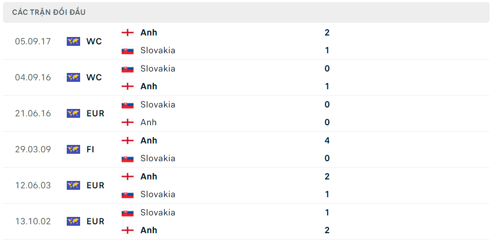 Anh bất bại trước Slovakia trong 6 làn đụng độ trong quá khứ, trong đó có 5 chiến thắng và 1 trận hòa.