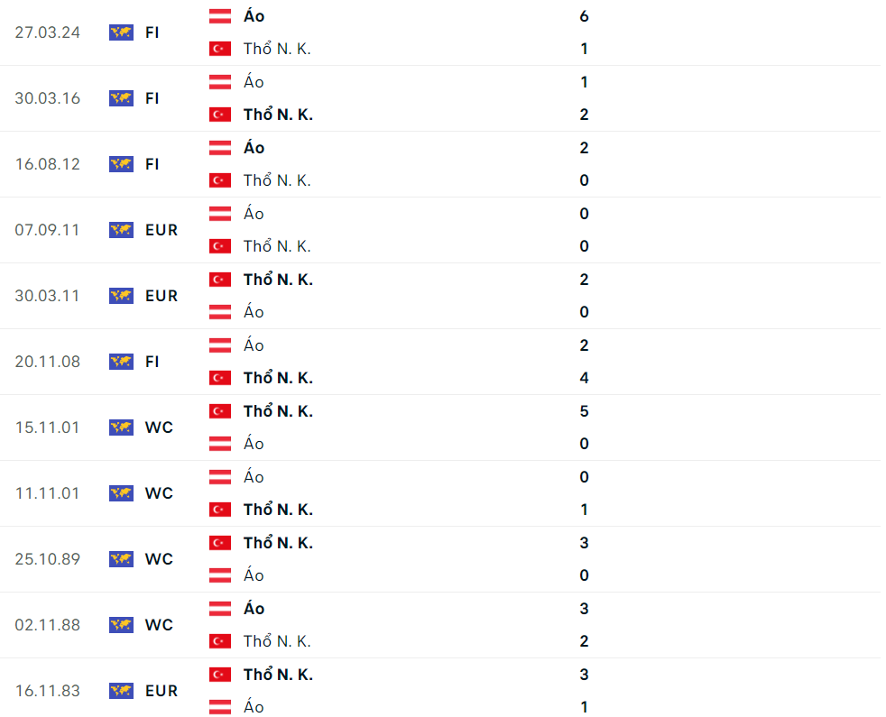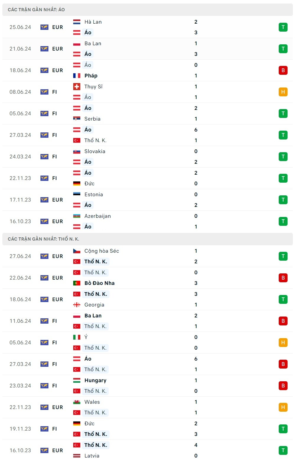 - Thổ Nhĩ Kỳ thủng lưới trong 3 lần gần nhất gặp Áo.