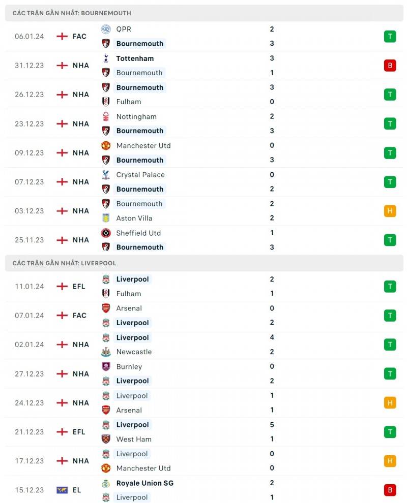 - Bournemouth đã ghi bàn trong toàn bộ 13 trận gần nhất. Liverpool cũng ghi bàn ở toàn bộ 6 trận gần nhất.