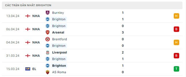 Brighton thua 2 và hòa 2 trong 4 trận gần nhất ở Premier League.