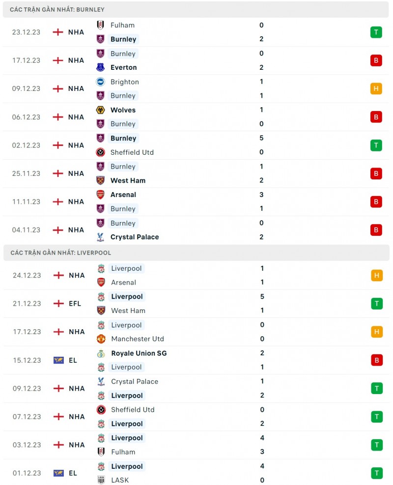 Thống kê cũng cho thấy 5 chuyến làm khách gần nhất trên sân của Burnley, đội chủ sân Anfield đều thắng. Ngược lại, kể từ khi bước vào chinh chiến ở giải Ngoại hạng Anh từ giữa tháng 8 tới nay, Burnley đã chơi khá tệ ngay cả khi thi đấu trên sân nhà.