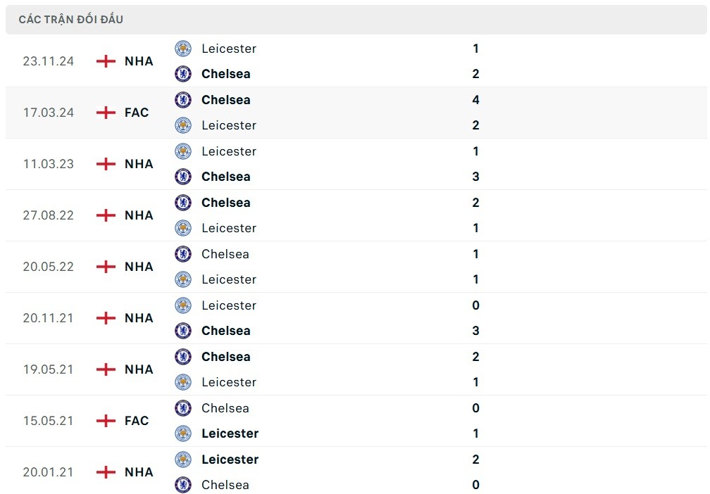 - Lần gần nhất Leicester thắng Chelsea là vào tháng 1/2021, khi họ giành chiến thắng 2-0.