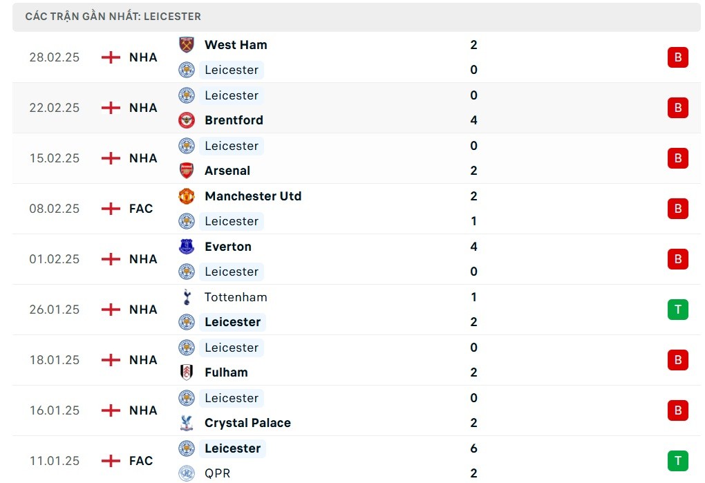 Leicester đã thua 4 trận gần nhất gặp Arsenal, Brentford và West Ham mà không ghi được bàn thắng nào. Đây là vấn đề cực kì nghiêm trọng với Leicester. 10 trận gần nhất của The Foxes tại Premier League chứng kiến đội bóng này chỉ ghi được có 4 bàn thắng.