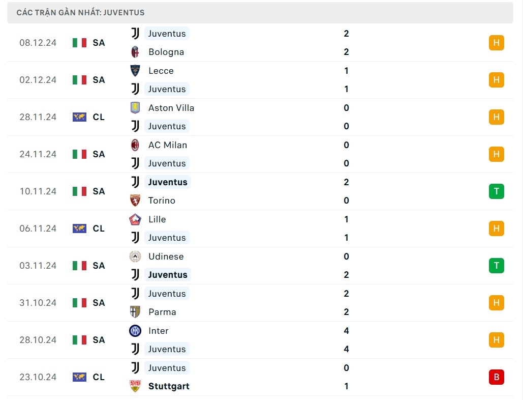 Giống như Man City, Juventus cũng có 8 điểm sau 5 lượt trận đầu tiên, họ hiện đang xếp thứ 22 trên BXH, thấp hơn Man City 2 bậc. Juventus đã khởi động ấn tượng tại Cúp C1 châu Âu mùa này, họ thắng trong 2 lượt trận đầu tiên, nhưng chỉ giành thêm 2 điểm ở 3 lượt trận gần nhất. Sau thất bại trước Stuttgart, đoàn quân của HLV Thiago Motta đã tiếp tục hòa với Lille và Aston Villa vào tháng trước.