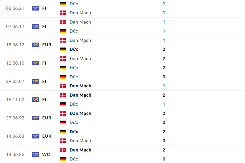 Đan Mạch thắng 2, thua 1 và hòa 3 trong 6 lần đối đầu gần nhất với Đức.