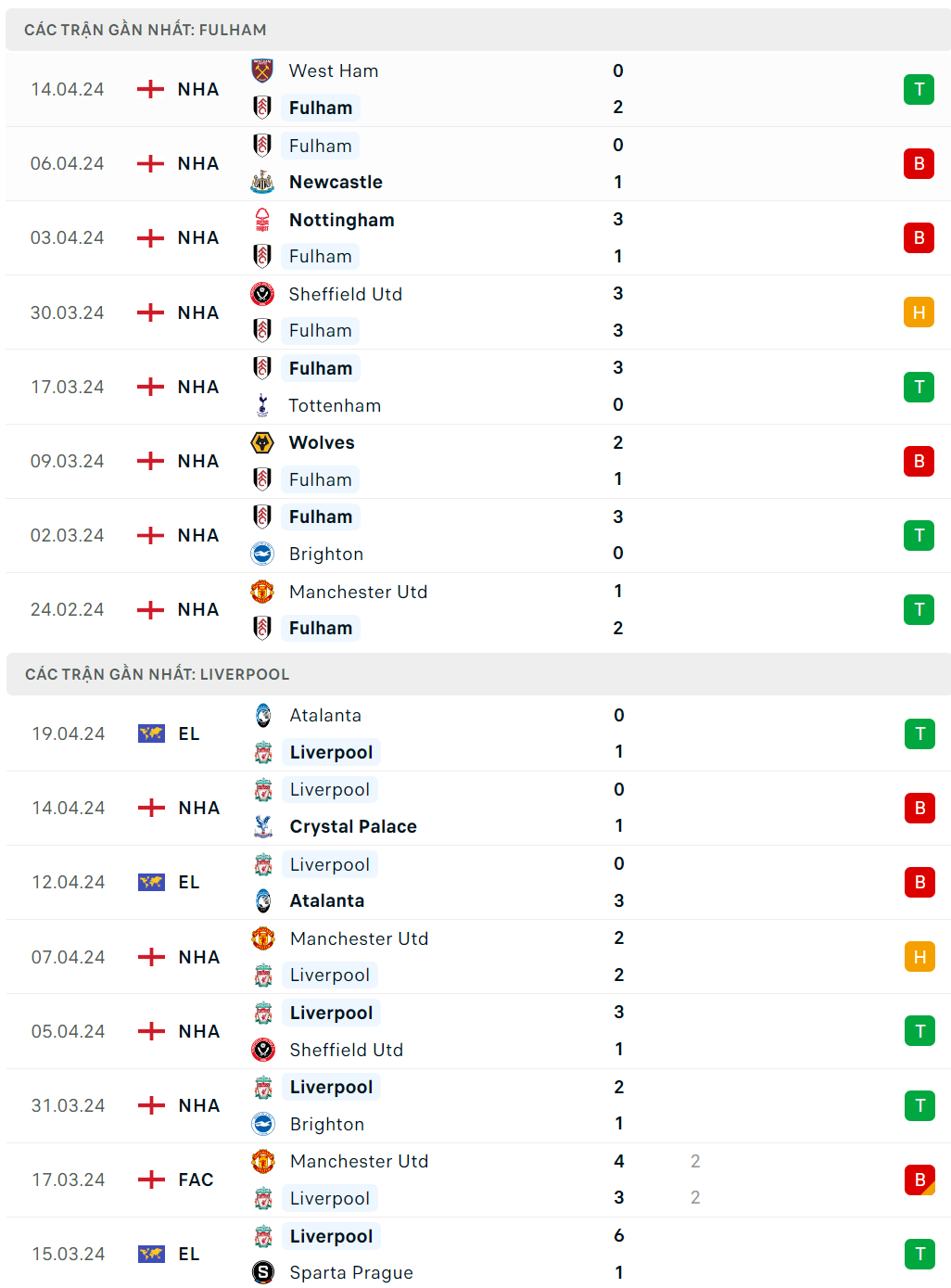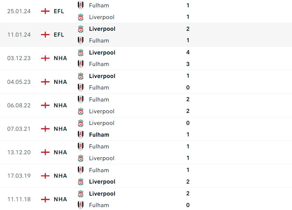 Xét về thành tích đối đầu, Liverpool vượt trội hoàn toàn so với Fulham. Fulham chỉ thắng 1 trong 11 lần gần nhất gặp gỡ Liverpool tại Premier League và phải nhận tới 8 trận thua. Đặc biệt hơn là Liverpool không thua trong 5 trận gần nhất gặp Fulham. Do đó sẽ không quá bất ngờ nếu Liverpool vượt qua đối thủ tại vòng 34 Ngoại hạng Anh sắp tới.