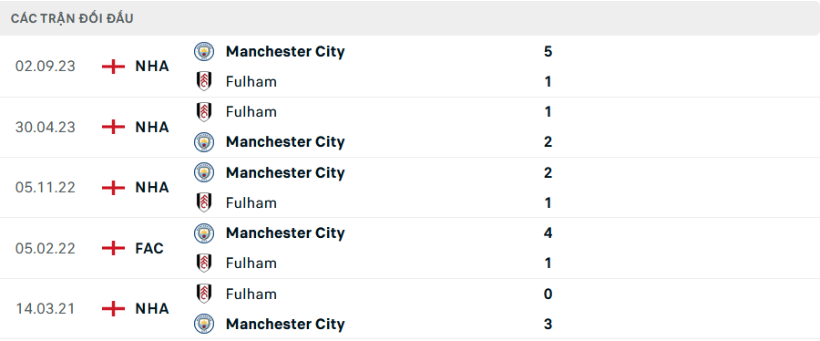 - Man City thắng 15 trận đối đầu gần đây, bất bại 20 trận.