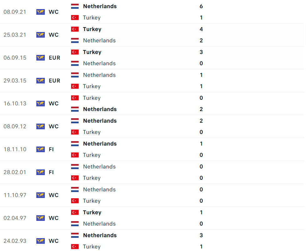 - Hà Lan thủng lưới trong 4 trận gần nhất đối đầu Thổ Nhĩ Kỳ.