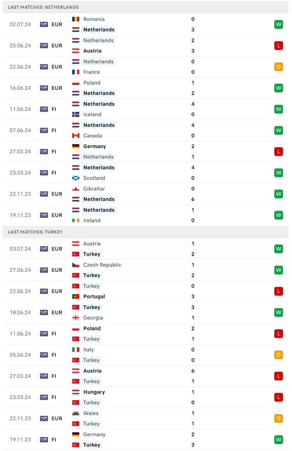 Trong khi đó Thổ Nhĩ Kỳ cũng không tỏ ra kém cạnh với hai chiến thắng liên tiếp trước các đội tuyển Séc và Áo với cùng tỷ số 2-1. Điều này hứa hẹn sẽ giúp họ có một tinh thần cùng quyết tâm cao nhất ở màn đụng độ Hà Lan sắp tới.