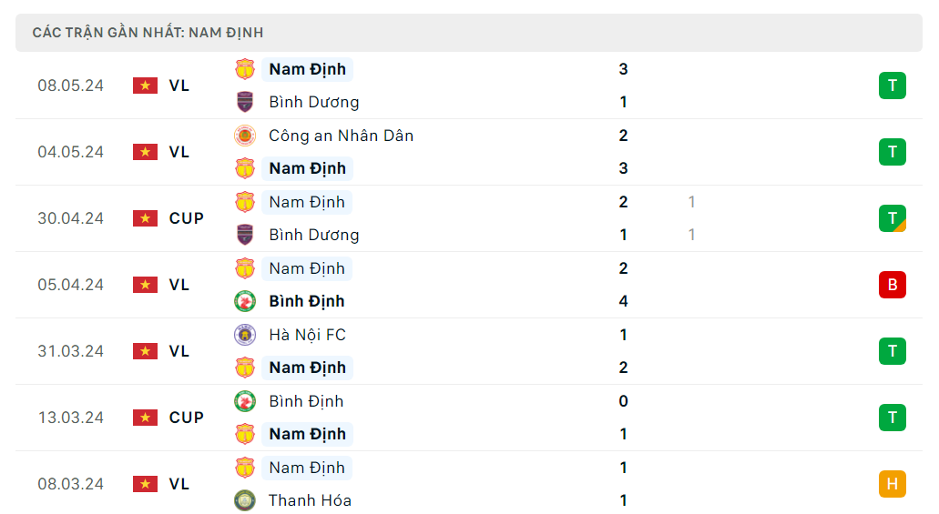 Về phía đội khách, 10 trận gần nhất, Nam Định đã giành tới 7 chiến thắng, trong đó có những chiến thắng trước các đối thủ trực tiếp như CAHN, Bình Dương, Hà Nội.