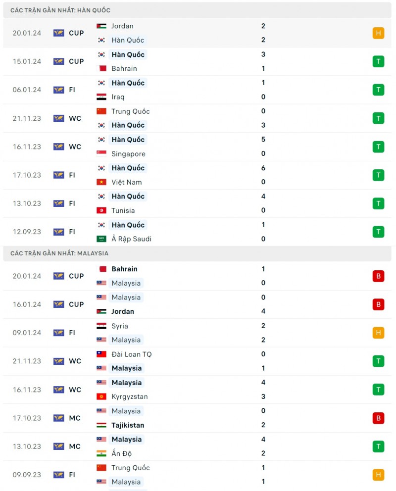 - Hàn Quốc toàn thắng trước Malaysia trong 4 trận gần nhất mà không để lọt lưới.