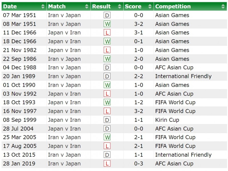 - Nhật Bản đang có thành tích đối đầu khá lạc quan trước Iran khi thắng 3, hòa 3 và chỉ thua 1 ở 7 lần so tài gần nhất.