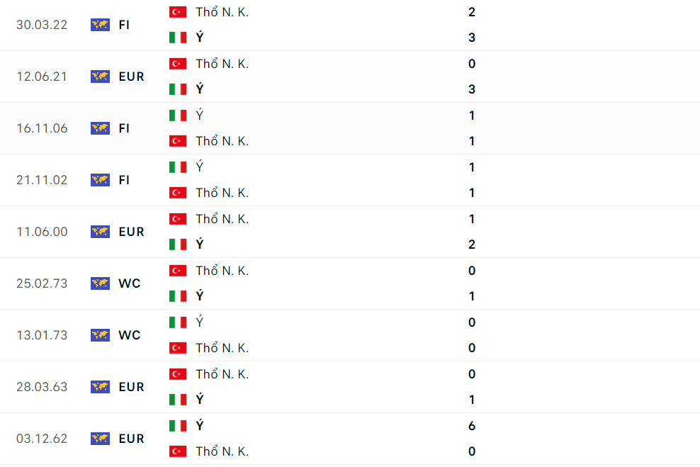 Nếu so sánh thành tích đối đầu thì Thổ Nhĩ Kỳ cũng tỏ ra hoàn toàn lép vế trước nhà đương kim vô địch EURO khi hòa 3, thua 10 trong 13 lần gặp nhau tính từ năm 1962 tới nay. Vì vậy, sẽ không bất ngờ nếu như Italia tiếp tục vượt qua Thổ Nhĩ Kỳ ở màn so tài sắp tới.
